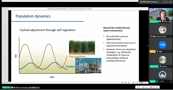 随后,Lioudmila Chatalova研究员由生物种群动态模型引申到人与自然的互动模型,指出人与自然在不断地进行周期性自我调节。