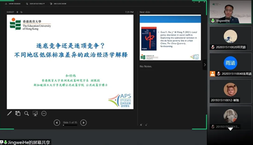 5月24日,香港教育大学和经纬教授做客我院公共管理论坛,带来了题为“逐底竞争还是逐顶竞争?不同地区低保标准的政治经济学解释”的主题报告。报告由学院副院长柯新利教授主持,来自校内外的120余名师生在线聆听报告并交流互动。