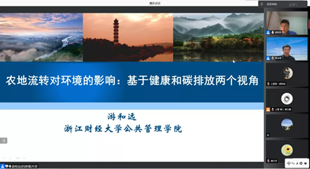 11月29日,浙江财经大学游和远教授做客我院公共管理论坛,带来了题为“农地流转对环境的影响:基于健康和碳排放的两个视角”的主题报告。报告由学院张安录教授主持,来自校内外的250余名师生在线聆听报告并交流互动。