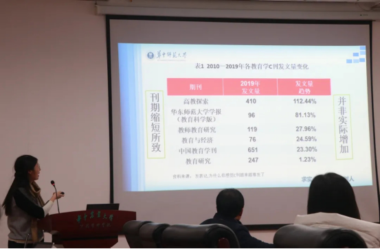 讲座伊始,叶庆娜主任首先介绍了当前教育学发文愈益困难的形势,对近十年各教育学C刊发文量的变化以及文章的供给需求变化进行了详细分析,指出当前存在“老-中-新”三代学者对发文需求的增加和各期刊年均总载文量趋势下降的供需矛盾。针对发文难的形势,叶庆娜主任从“迎难而上”、“锤炼文章”、“抢占先机”三个方面给出了应对建议。随后,叶庆娜主任对各类教育学C刊的篇幅进行对比,指出目前教育学期刊文章受学术标准规范化的助推、学术质量提升的推动以及期刊学术评价标准强化带来的影响,在形成上“长文渐受青睐”。对此,叶庆娜主任分别从“格式规范”、“厚积薄发”、“内容为王”、“精准定位”四个方面展开给在读研究生提出应对建议。