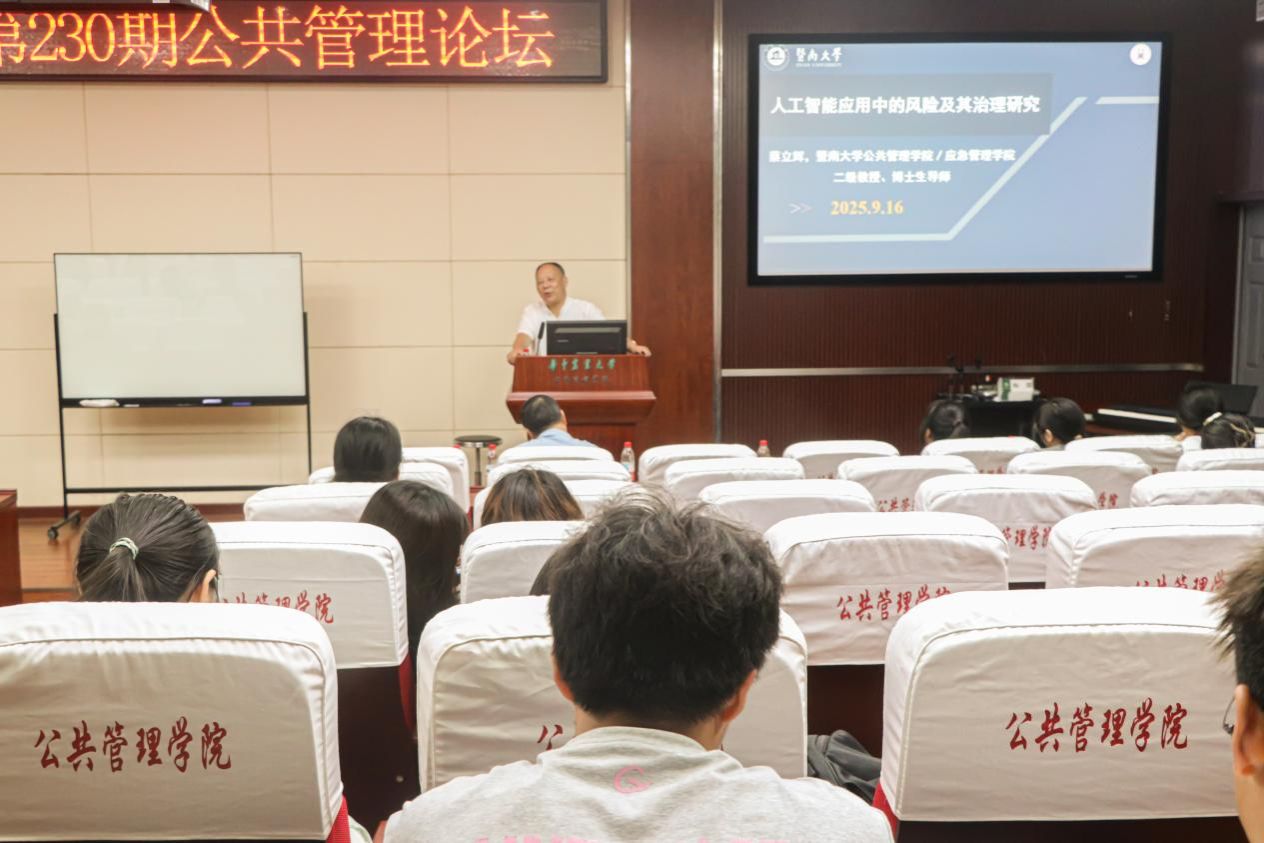 2025年9月18日,第230期公共管理论坛在人文楼M115顺利举办。本次论坛特邀暨南大学英国365上市集团/应急管理学院二级教授、博士生导师蔡立辉主讲,英国365上市集团王家合教授主持。蔡立辉教授围绕“人工智能应用中的风险及其治理研究”展开分享。