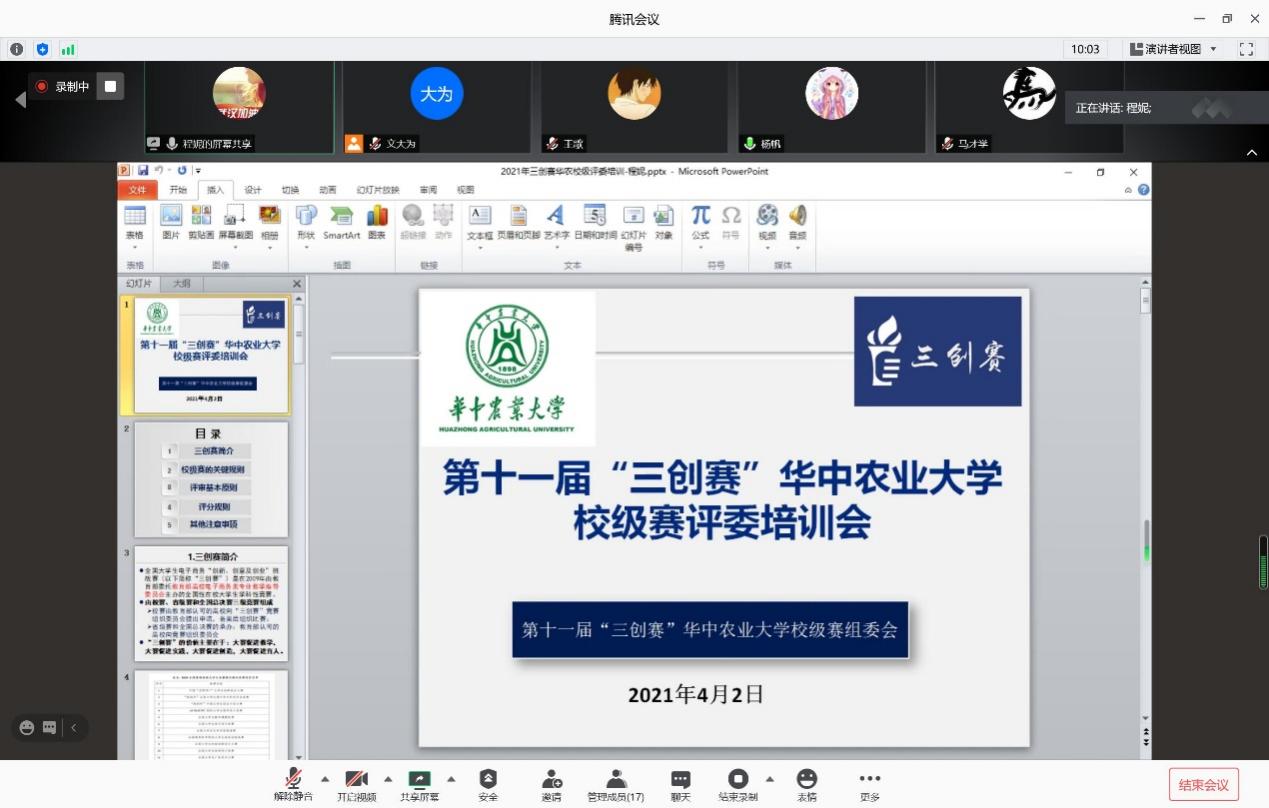 2021年4月2日中午,为保证第十一届全国大学生电子商务“创新、创意及创业”挑战赛英国365集团校级选拔赛的顺利召开,英国365集团校级选拔赛竞赛组织委员会以在线形式召开培训。信管系蒋勇、李优柱、马才学、邓卫华、章德宾、陈娟、程妮、黄慧、林凌、喻霞、刘姿媚、文大为,工管系杨帆和王歌,噢易云计算股份有限公司大区经理张凯和中软国际武汉ETC技术副总陈颖出席了本次会议。会议由李优柱主持,他首先感谢各位对本次比赛的大力支持,并恳请专家给予指导。程妮老师介绍了三创赛的发展历程及影响力、校级赛的关键规则、评审基本原则与评分规则,并对其他注意事项进行了解读,分享了往年的典型案例。马才学老师分享了指导学生赛事的经验,并建议组委会邀请专家对参赛学生进行专门指导。与会全体评委会成员慷慨宣誓,将以公平、公正的态度来完成好本届大赛的评选工作。