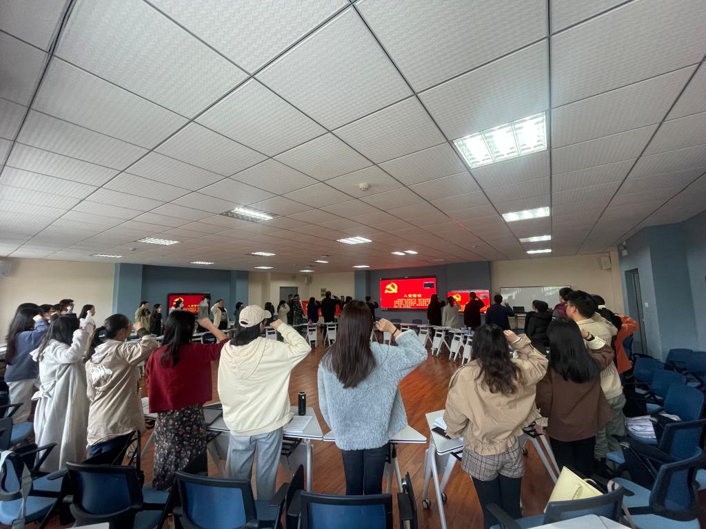 工程管理本科生党支部王炳坤带领全体党员重温了入党誓词。工程管理系教工党支部书记周义从三个“需要”、两个“确立”、五大“历史意义”、十个“坚持”、牢记一个“根本问题、四个“必须”、一个“号召”等7个方面全面领学了十九届六中全会会议精神。