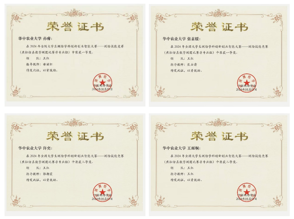近日,由中国测绘学会教育工作委员会(以下简称“测教委”)主办、滇西应用技术大学承办、南方测绘集团协办的2024年全国大学生测绘学科创新创业智能大赛在昆明隆重举行。经过激烈角逐,由我院毋丽红老师指导的孙睿同学(土地资源管理专业)、焦云清老师指导的张茗媛同学(土地资源管理专业)凭借优异表现斩获全国一等奖;郭朝霞老师指导的许奕同学(土地资源管理专业)、王红老师指导的王雨桐同学(园林专业)荣获全国二等奖。