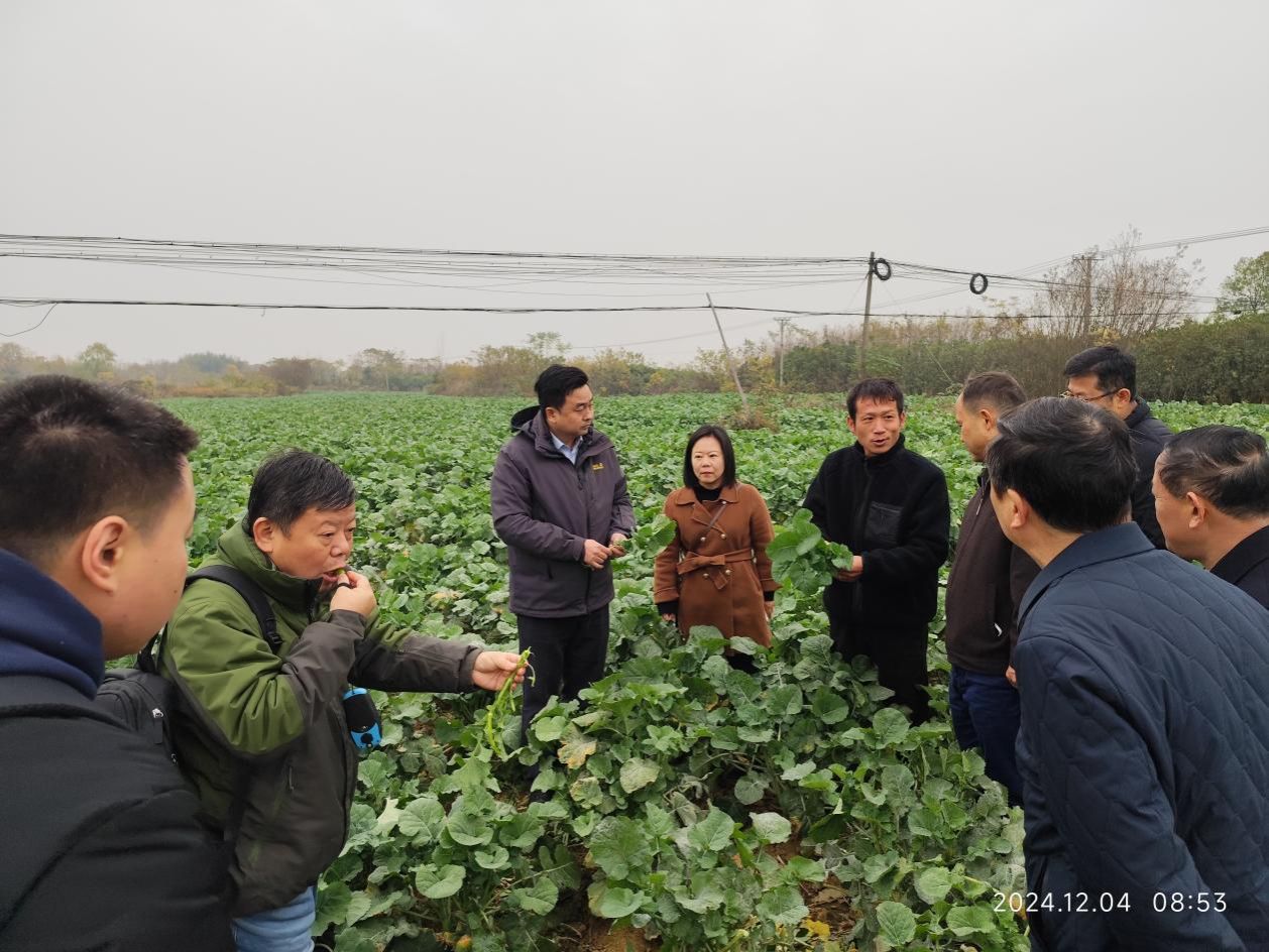 王建鸿一行首先走访了黄陂区六指街道武汉佰芳圃农林科技专业合作社,实地查看了头雁学员袁焱金种植的板蓝根菜苔。袁焱金详细介绍了他通过参加头雁学习,从课堂了解、专家搭桥、企业连接、合作引进、初尝甜头、大力发展的一条种植板蓝根菜苔的致富之路。胡银根教授针对板蓝根菜苔的种植,施肥,灌溉和加工储存等方面的问题,提供了技术指导,希望企业以绿色发展为目标,走可持续发展路线。