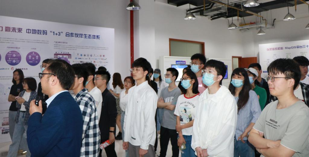 活动伊始,新中地教育市场部经理方胡朝带领师生一同参观了中地数码历史文化馆、MapGIS产品展示中心和办公区域。在产品展示中心,同学们了解了中地数码自主研发的具有全空间一体化、自主安全可控、大数据深度融合等优势的云端核心产品。在参观第十层办公区域时,同学们直观地感受到了中地数码开放的办公环境,方胡朝也表示,公司注重对技术和人才资源的积累培养,致力于营造团结和谐的工作氛围。