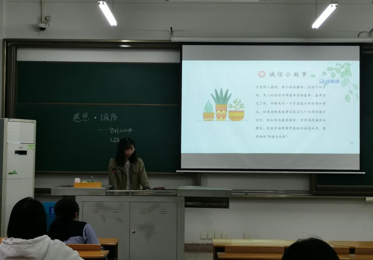 5月21日上午,学院管理科学与工程类2001班和2002班联合开展了以“立做诚信之人,心怀感恩之心”为主题诚信感恩教育班会。管科2002班长鲜智鹏以一则幽默而深刻的短片切入正题,视频中出现的因作弊而忏悔的学生和随时间流逝而老去的父母,引发了同学们对于“诚信”和“感恩”的深刻思考。鲜智鹏表示:不信不立,不诚不行。我们强调“诚信”与“感恩”不仅仅是为了遵守法规、合乎伦理,更是为了培养大学生高尚正直的理想信念和价值取向,时刻以诚信感恩之心待人处事,铭记信以立志,信以守身,信以处世,信以待人。