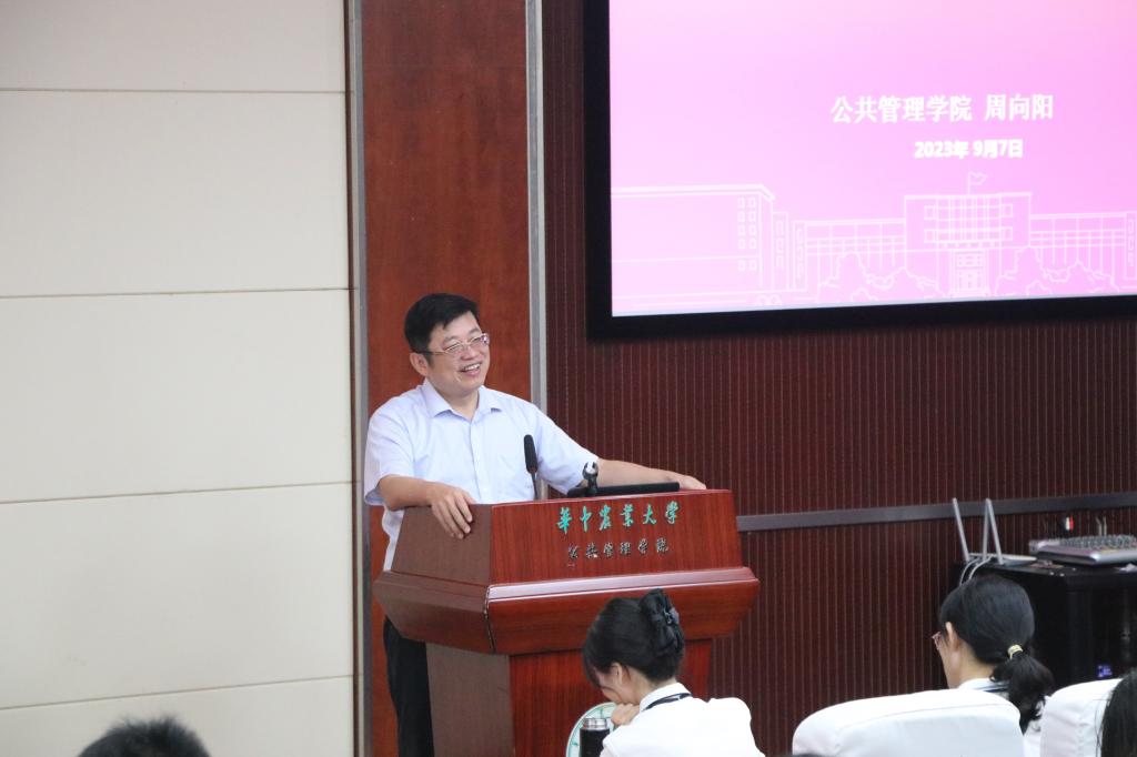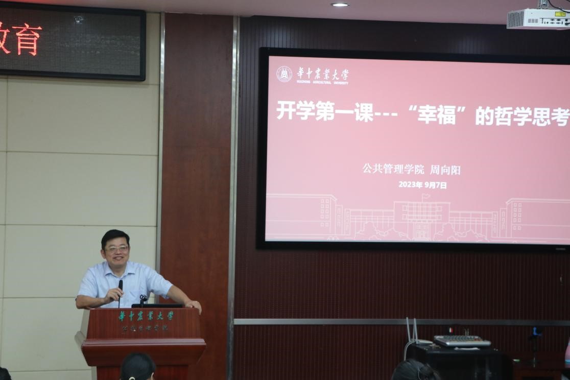 “幸福是人追求的最终的目标”,学院党委书记周向阳分享了以“开学第一课:幸福的哲学思考”为主题的报告。周书记从“幸福公管”的学院建设目标出发,引导研究生新生积极做“一流公管”“幸福公管”的建设者,在实践中努力成为一个更充实、更幸福、更有力量的人。