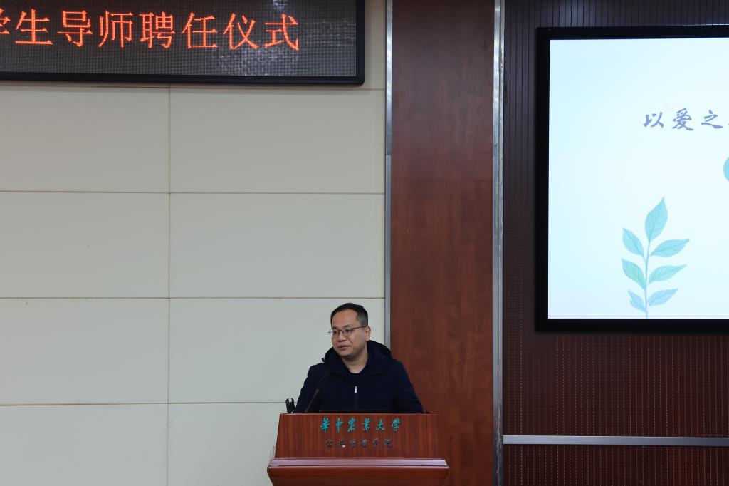 行政管理2002班的汪扬作为学生导师代表发言。他从初心、使命、担当等三个角度,阐述了自己成为学生导师的初心和未来的工作计划,鼓励所有学生导师以身作则、以心换心,号召大家尽心竭力、善始善终、善作善成,为帮扶对象提供关爱和支持、信任和鼓励、理解和包容、欣赏和肯定。