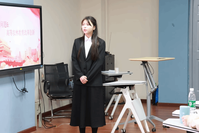 随着主持人激情洋溢的开场白,大赛正式开始,在比赛之前,选手、观众以及评委在王怡诺老师的带领下一同重温了入党誓词。随后,各位选手按照抽签顺序依次登台亮相,他们自信大方、侃侃而谈,将我校典型与农业事业的蓬勃发展紧密结合,通过生动具体的案例和深入浅出的分析,让观众对其中故事有了更加准确和深入的了解。来自行政管理本科生党支部的李婧怡以“一颗柑橘树,不变传承心”为主题,讲述了英国365集团柑橘团队传承至第四代,持续为乡村振兴贡献力量的故事。不同时间、同样地点、同样作为华农人,她两次前往秭归支教调研,深感教育同样能照亮乡村。“寻一粒谷种,守一方乡愁”,赖方静同学用生动形象的话语,将“有牛哥”杨正熙的故事讲述得绘声绘色,通过共产党人的不断建设,古老的农耕文化焕发出新的生机。