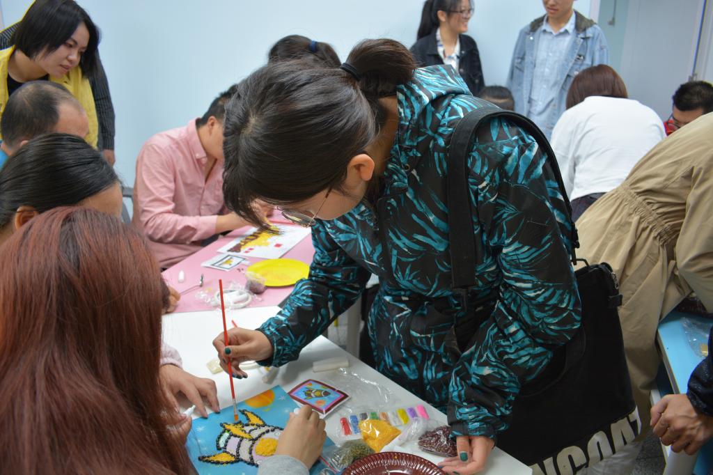 随后进入豆贴画制作环节。要做好一幅豆贴画并不容易,需要耗费一定的时间和精力。志愿者们决定以两两组队的形式帮助患者们完成特色豆贴画。志愿者手把手教大家贴豆子上颜料,鼓励大家调动想象力、大胆创作。在志愿者的耐心指导下,大家都顺利地完成各自的画作。志愿者还同患者们分享、交流自己对于国家兴盛的感触以及对国家美好未来的憧憬。活动最后,大家合影留念。