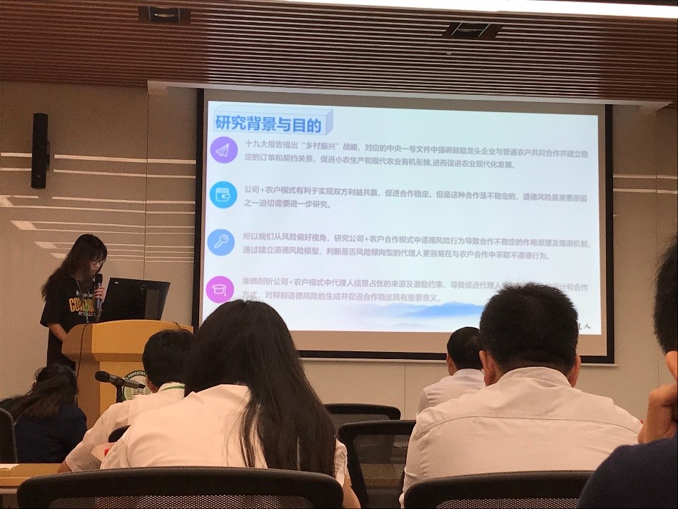 会上,国创项目主持人刘庆庆做了题为:“公司+农户模式中的道德风险与合作稳定研究:基于风险偏好视角”的论文汇报。其他作者有章德宾副教授、项朝阳副教授,此研究指出:代理人道德风险的发生的作用强度变化,与委托人对代理人类型的了解程度(信息不对称程度)呈现弱正向相关关系。偏好风险且高效率的代理人,其最终实际成交量差异更大,因为道德风险使越高效的爱好风险类代理人表现更不稳定。同时给出建议:如果要促进公司+农户合作的最终成交销量,则需要对风险爱好类且高效率的代理人给以更多且及时的关注。如果要提高农户合作满意度和合作稳定则高效率且风险爱好不非常突出的代理人,可能会有更稳定的合作预期。